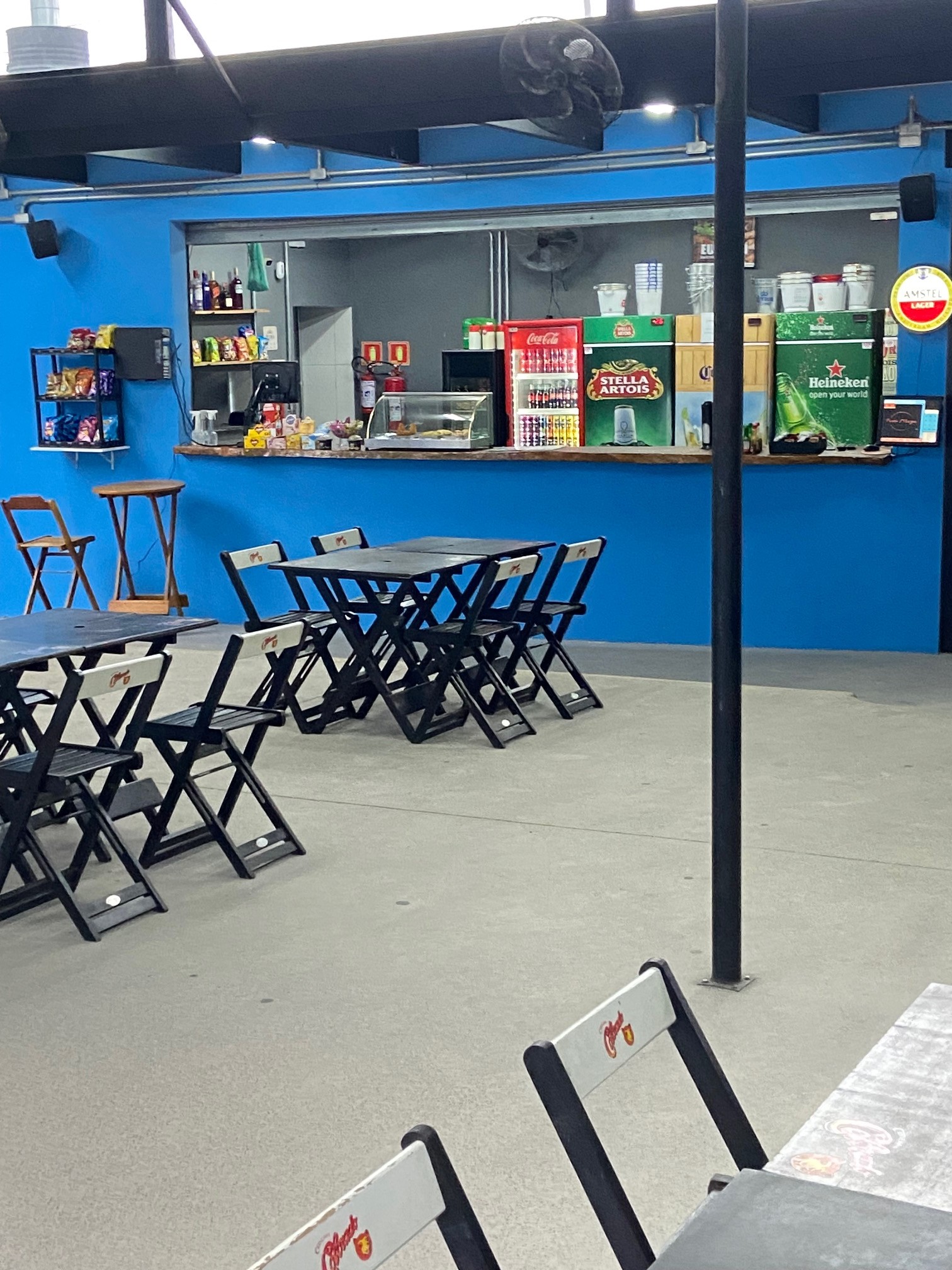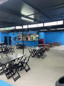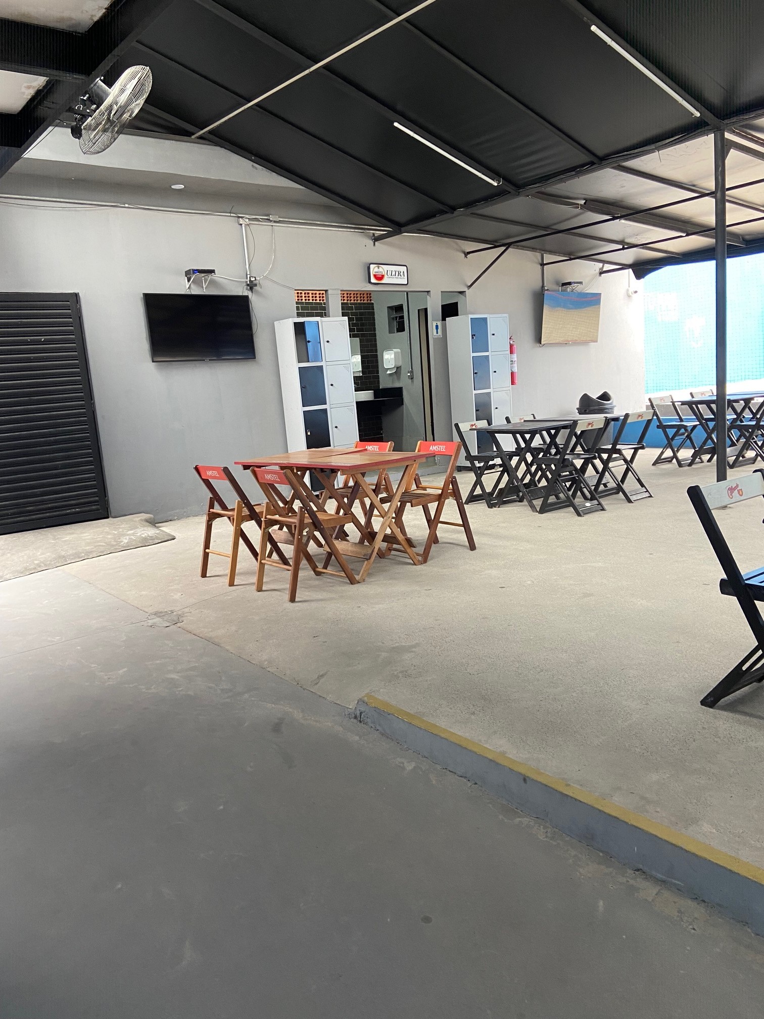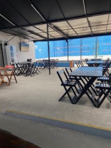Amplo salão coberto no térreo, equipado com mesas e cadeiras.