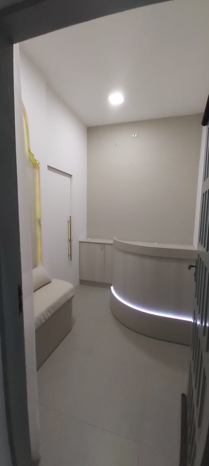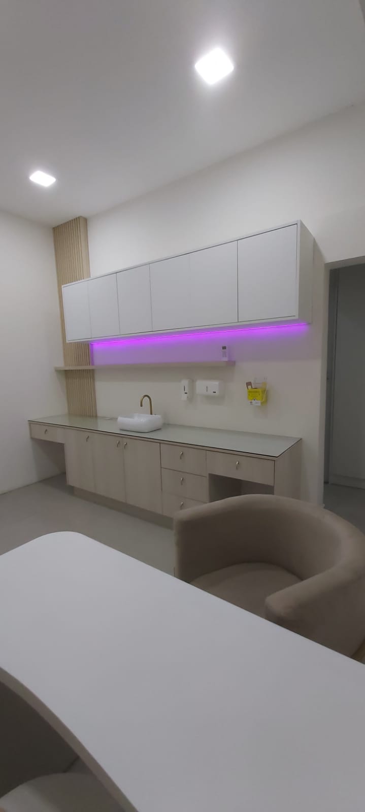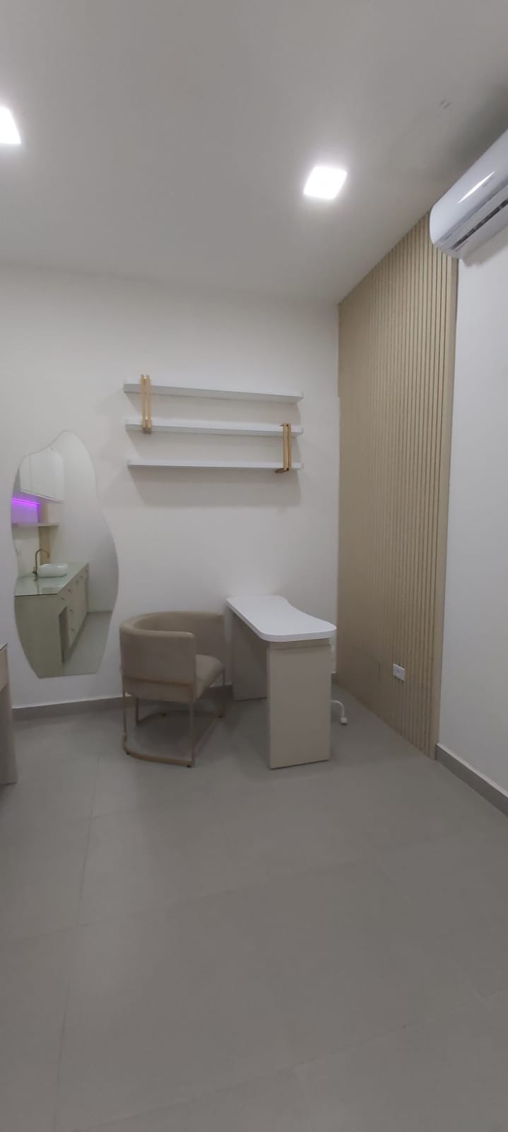✅ Sala de Atendimento Completa: Armários com LED, espelho orgânico, mesa e poltrona com detalhes dourados, espaço para frigobar e área de estoque.