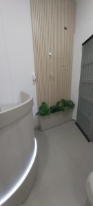 ✅ Recepção Aconchegante: Balcão orgânico iluminado, painel decorativo e banco baú.