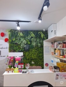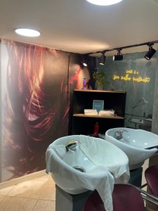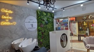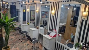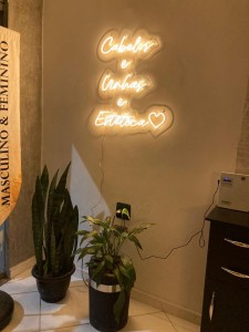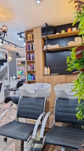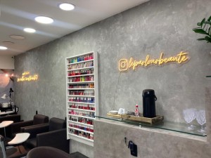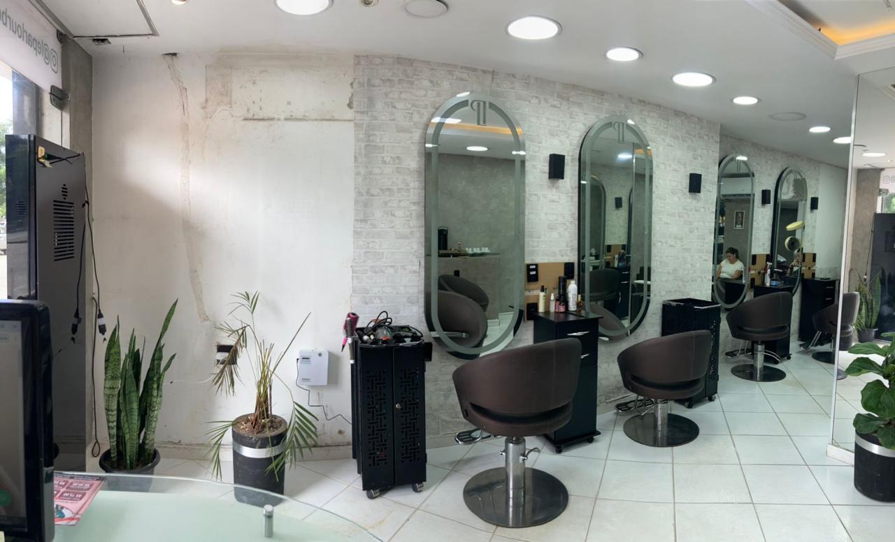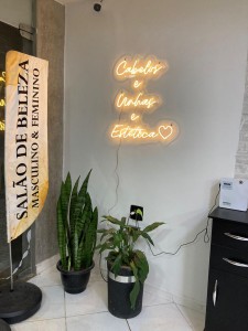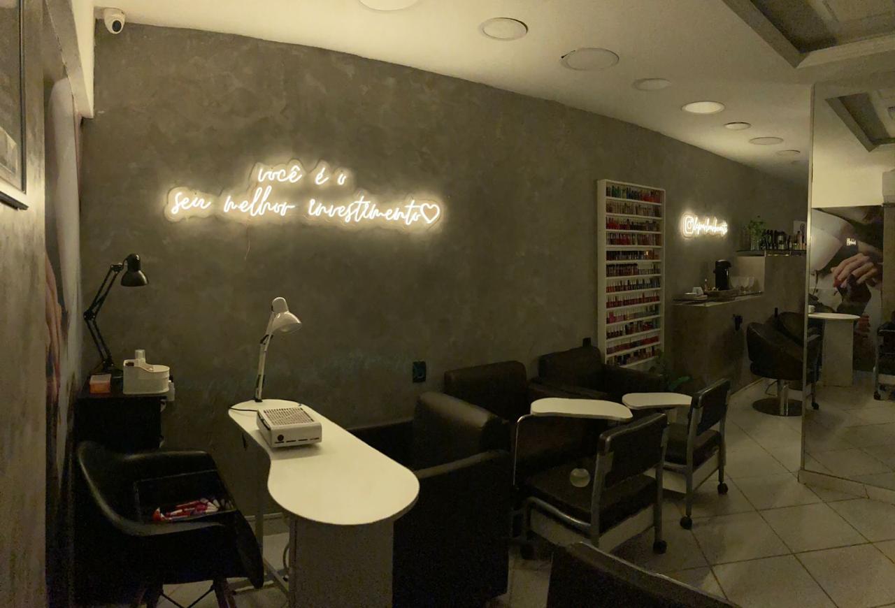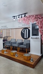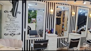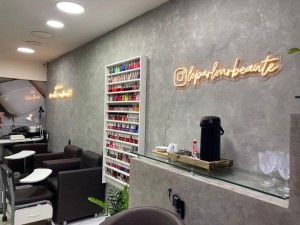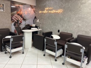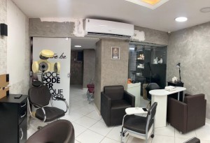 3 estações de cabeleireiros com espelhos em led, carrinhos auxiliares e cadeiras hidráulicas, recepção e expositor de produtos, 4 estações de manicure, 2 lavatórios, cozinha equipada com geladeira e microondas, 1 banheiro
