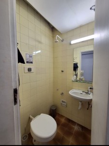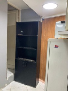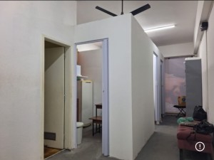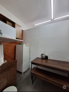 Cozinha equipada com pia, armários aéreos, geladeira, microondas e mesa de refeições, 2 salas de atendimento em dry wall