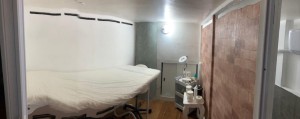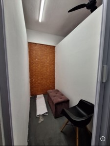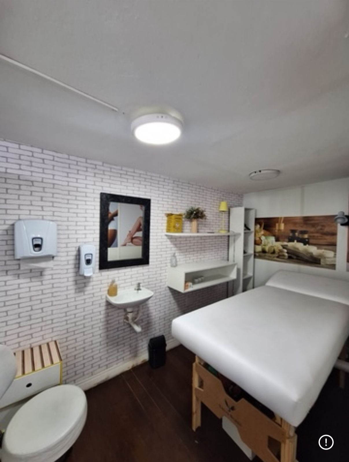 1 sala de estética com maca, nichos aéreos e pia, 1 estação de design de cílios e sobrancelhas com poltrona reclinável.