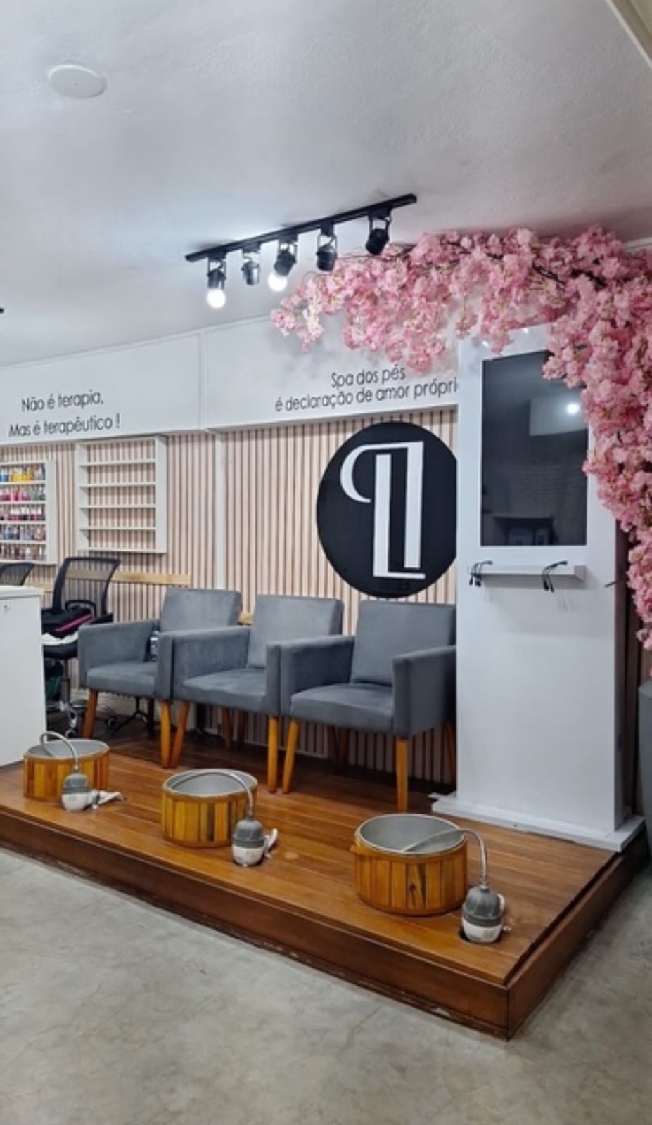 Área de tablado de spa dos pés com 3 estações, 3 postos de manicure (mesa)